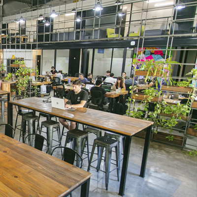 • Más de 1000 m2 de inspiración: un ambiente moderno y luminoso con mobiliario de madera reciclada y una atmósfera que invita a la creatividad y el trabajo en equipo.
